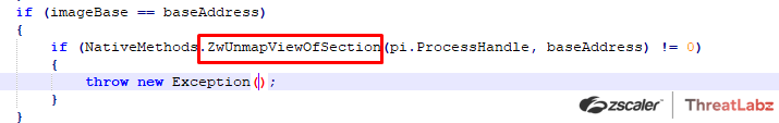 The payload then unmaps or empties out the target process memory via ZwUnMapViewOfSection()