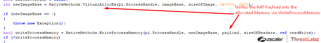 Then, memory is allocated in the remote target process depending on the size of the payload via VirtualAllocEx(), then the Final RAT Payload is written at the allocated memory location via WriteProcessMemory().