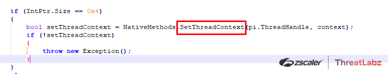 Towards the end of the process hollowing, the threat context is reconfigured via GetThreadContext() and SetThreatContext() and the SetThreadContext() post reconfiguration points to the beginning of the malicious code.