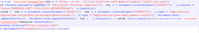 The next page (the 4th HTTP request) contains both inline obfuscated Javascript, and an external script (obfuscated as well). Once deobfuscated, the exploit is very simple - it invokes the ActiveX control or the Java Quick Starter with the URL of the malicious JAR file.