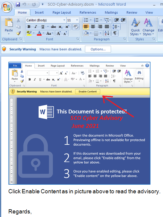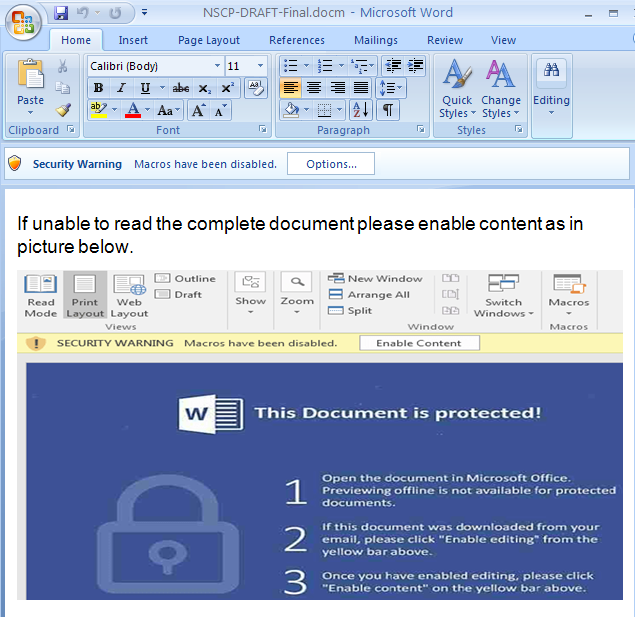 Figure 5: Attached .Docm file prompts the user to enable macros