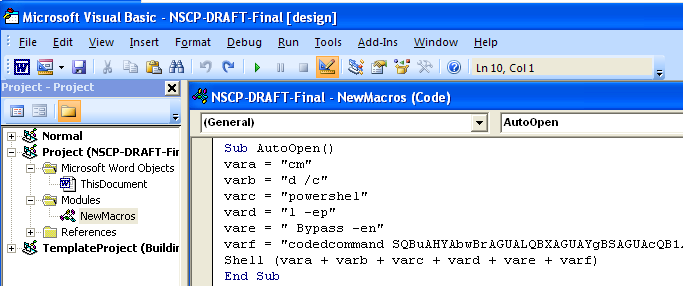 1.) The first document we analyzed has a macro code containing a PowerShell script to download the final payload and execute it.