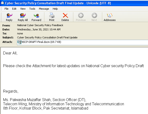 The email was sent on Wednesday, June 30, 2021 10:44 AM (PKT) with the subject “Cyber Security Policy Consultation Draft Final Update” to lure the recipients into opening an attached file named “NSCP-DRAFT-Final.docm”. The mail body contained information on the latest updates of the National Cyber Security Policy Draft along with the signature of a senior official to make the email look more professional and genuine.