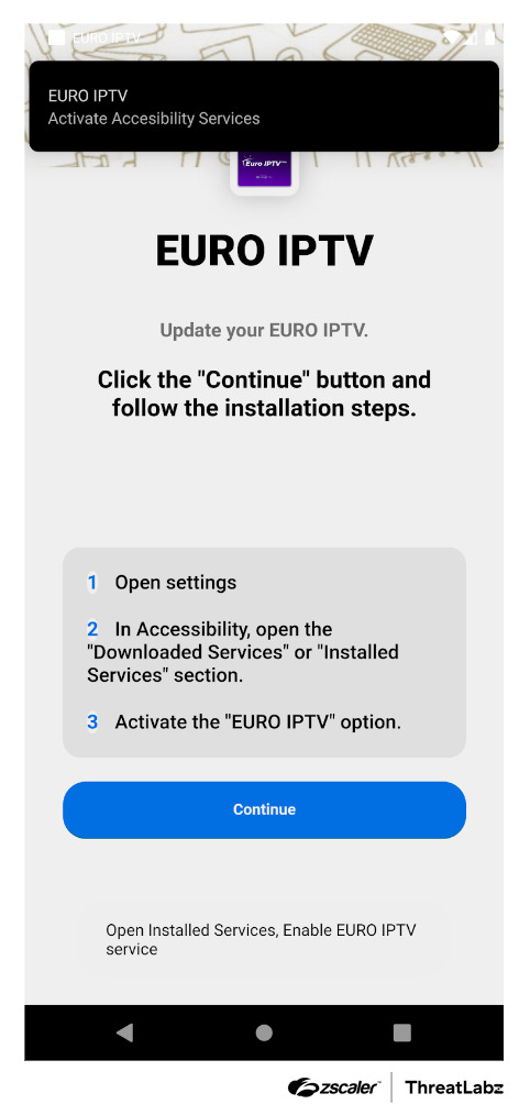Upon launching the application, the user is shown an attacker-defined message screen asking the user to enable the Accessibility Service permission for the application, as shown in the figure below. The Accessibility Service is a legitimate feature on Android phones to assist users with disabilities, however due to the inherent nature of the service, the feature may provide a threat actor with highly granular control over a victim's phone if enabled. If Copybara is installed and not granted the accessibility permission, the malware repeatedly shows notifications and toast messages (as shown in the figure below) to coerce the victim into enabling the service.