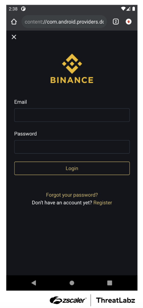 Once the Accessibility Service feature is enabled, the application prevents the user from accessing some options in the Settings menu, ensuring they are unable to uninstall Copybara. In the background, the malware’s behavior is determined by its configuration. Copybara is designed to download a list of phishing pages from the C2 server. The Copybara C2 responds with a ZIP file containing counterfeit login pages that mimic popular cryptocurrency exchanges and financial institutions. During our analysis, we discovered the existence of two operational C2 servers that were actively serving the phishing pages.
