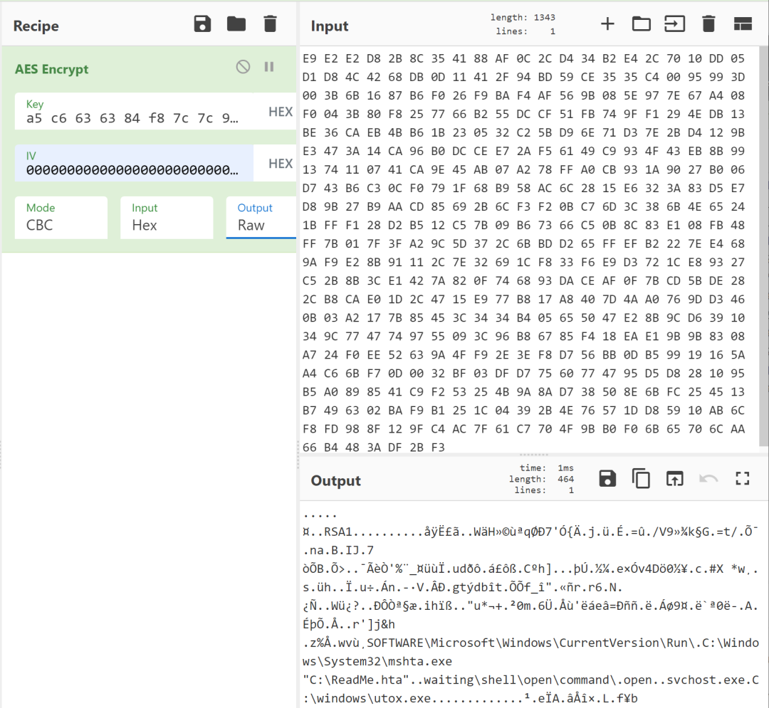 This stage decrypts a second configuration using AES-CBC with the following key 5060303003020101a9ce67677d562b2b19e7fefe62b5d7d7e64dabab9aec7676 (which is the second block of 32 bytes from the lookup table Te1). According to this decrypted configuration, the shellcode executes a batch file to delete shadow copies and remove events from the logs. Essentially the following commands are run::