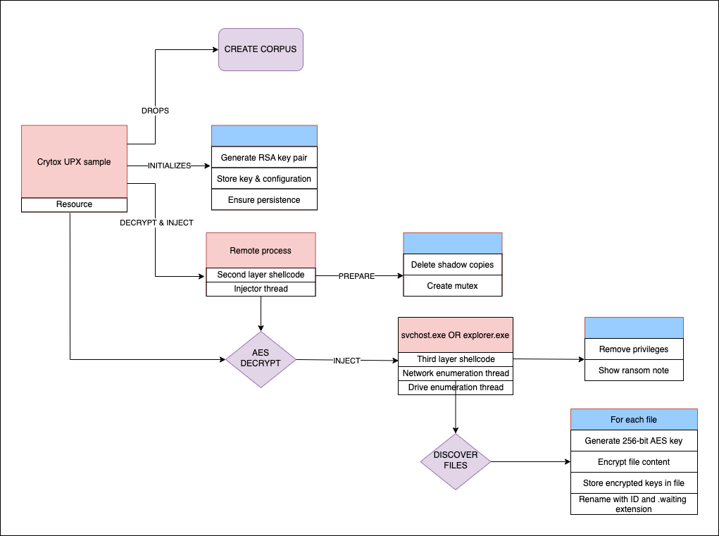 Crytox exposes some interesting features to hinder static analysis by self-decrypting itself several times, injecting shellcode inside different processes, encrypting its configurations and using API hashing. The main file encryption logic of Crytox is standard using a unique AES key per file that is protected with RSA. However, the author(s) chose to rely on a weak random generator to create new AES keys. Using a 32-bit integer as the seed is not sufficient with today's computational power.