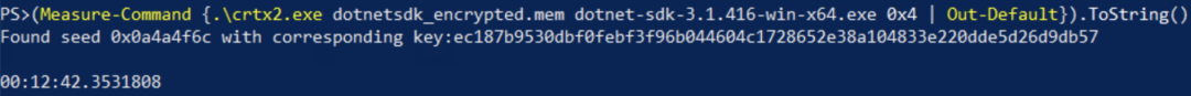 Figure 8 shows an bruteforce program running on a machine with 16 logic cores. Here, the encrypted file was dotnet-sdk-3.1.416-win-x64.exe (SHA1: 83A53E8770EDD38EDDD37DED63CEF2253FC16979) and the known plaintext was the Windows PE (MZ) file header 4D5A9000.