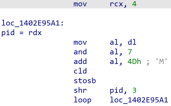Inside a new thread, the shellcode creates a mutex by concatenating a hardcoded 4-letter word (e.g., "CSWS") with some random characters based on the pid of the targeted process as shown in Figure 4.