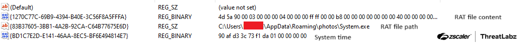 DarkVision RAT creates a registry key under HKEY_CURRENT_USER\SOFTWARE\ and adds three values, each named using a hardcoded GUID. The values stored are the following:
