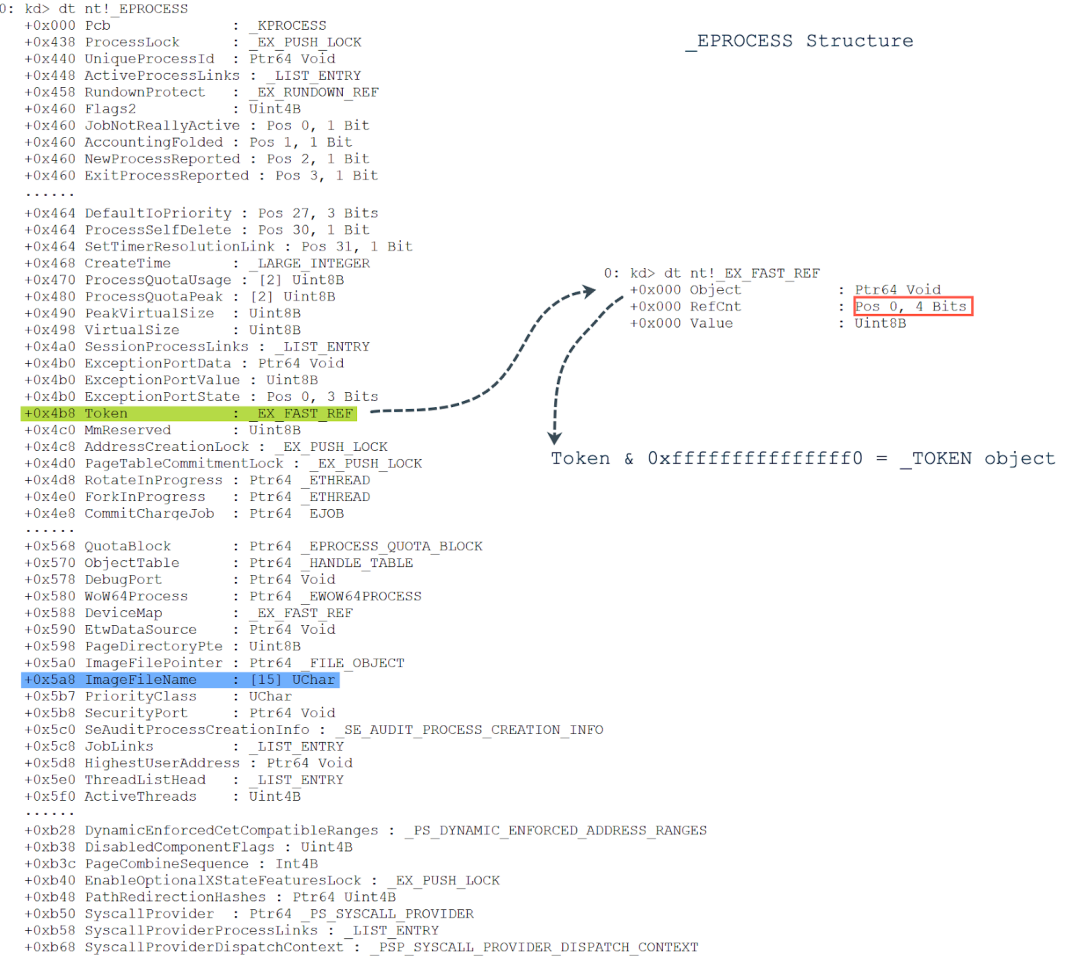 The Token field is stored at offset 0x4B8 in the _EPROCESS structure. The _EPROCESS.Token points to an _EX_FAST_REF structure rather than a _TOKEN structure. Based on the layout of the _EX_FAST_REF structure, its three fields (Object, RefCnt, Value) have the same offset, the last 4 digits of the _EX_FAST_REF object represents the RefCnt field that denotes the reference to this token. Therefore, we can zero the last 4 digits out and get the actual address of the _TOKEN structure.