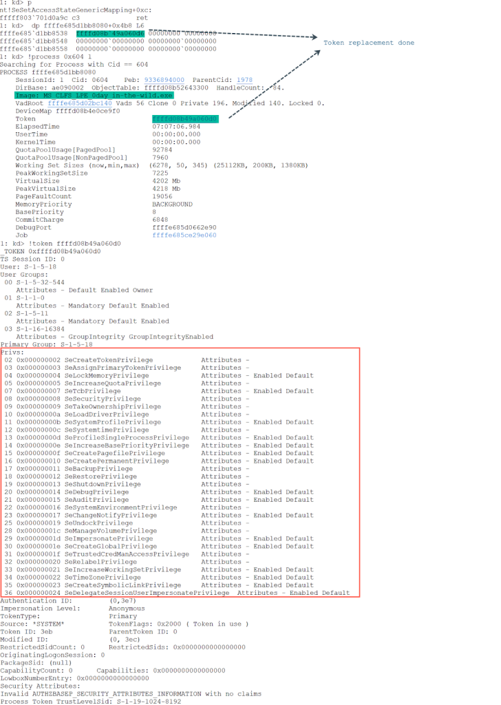 At the end of the SeSetAccessStateGenericMapping function, the token replacement has been completed in Figure 27. The Token for the current process has been replaced with the Token for the System process (PID 4). This means that the current process has successfully elevated privileges to SYSTEM.