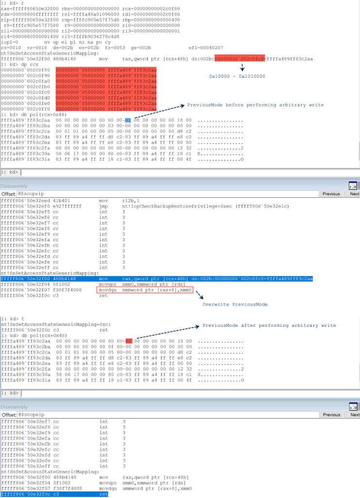 At the end of the SeSetAccessStateGenericMapping function, the PreviousMode in the _ETHREAD object is set to 0, which means that it allows an unconstrained read/write operation across the whole kernel memory using NtReadVirtualMemory and NtWriteVirtualMemory. This is a powerful method to enable the read/write. At this point, the exploit is ready to perform an arbitrary write.