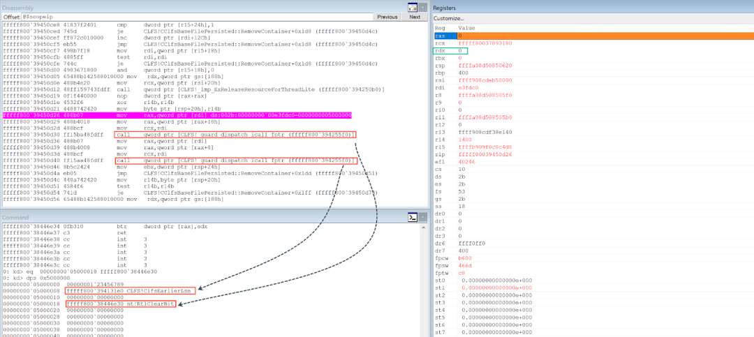 2. Trigger the CLFS vulnerability to complete token replacement. The CClfsBaseFilePersisted::RemoveContainer function will be hit. Figure 25 shows the location of dereferencing a corrupted pointer to a fake CClfsContainer object in CLFS.sys. The data that the address being dereferenced points to can be controlled and manipulated by heap spraying in user space.