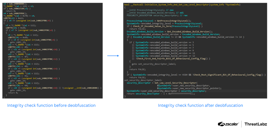 set_cmt(xref.frm, FUNCTION_NAME, 0)The figure below illustrates a function that checks Zloader’s process integrity level, before and after deobfuscation.