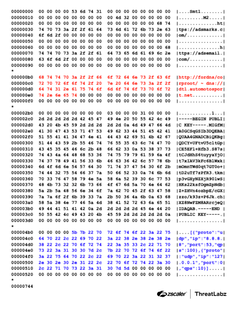 The figure below shows the modified static configuration, including the new location of the C2 domains, the mini JSON format, and a placeholder entry for an additional DNS server.