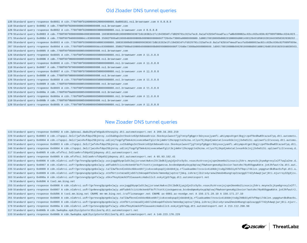 Figure 3: Example DNS C2 message comparison between the old and new versions of Zloader.
