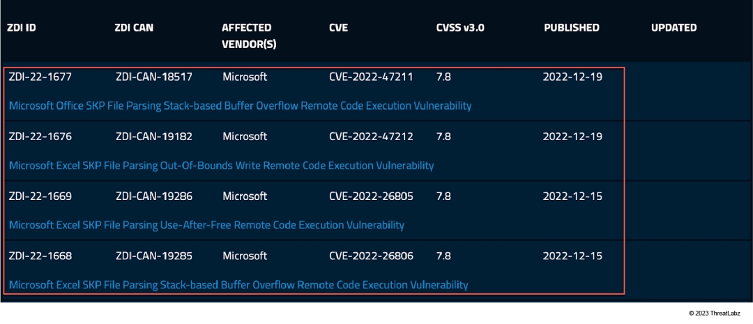 Figure 1: 4 vulnerability advisories about Microsoft Office SKP files from ZDI