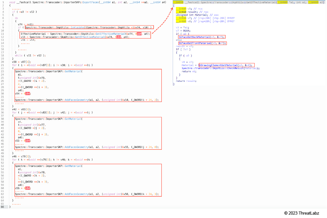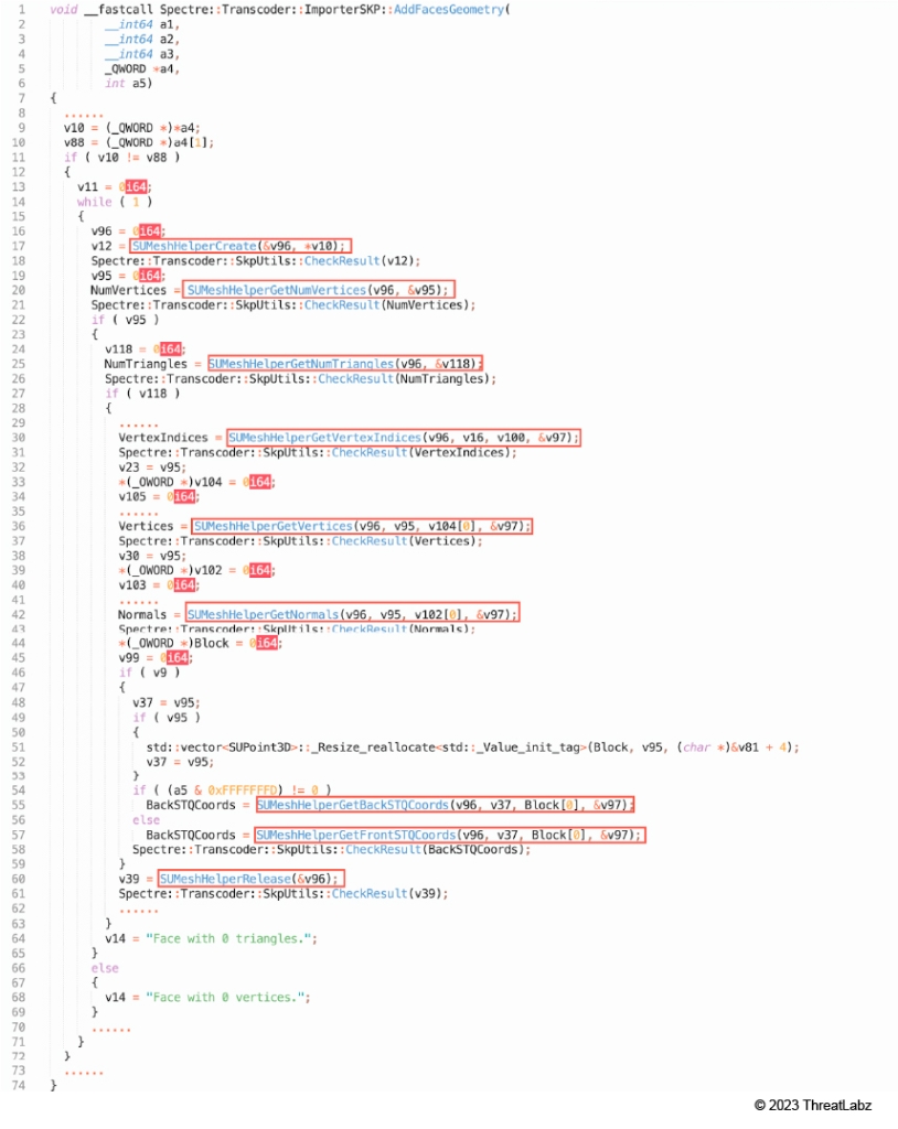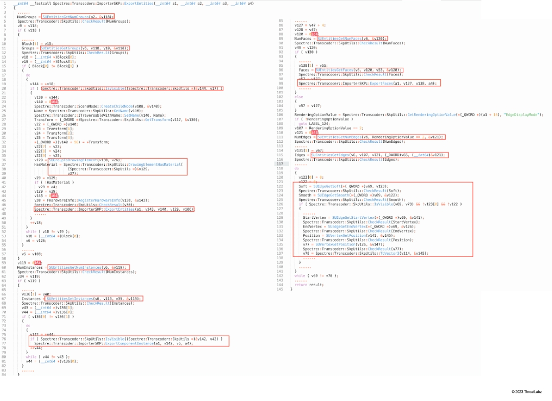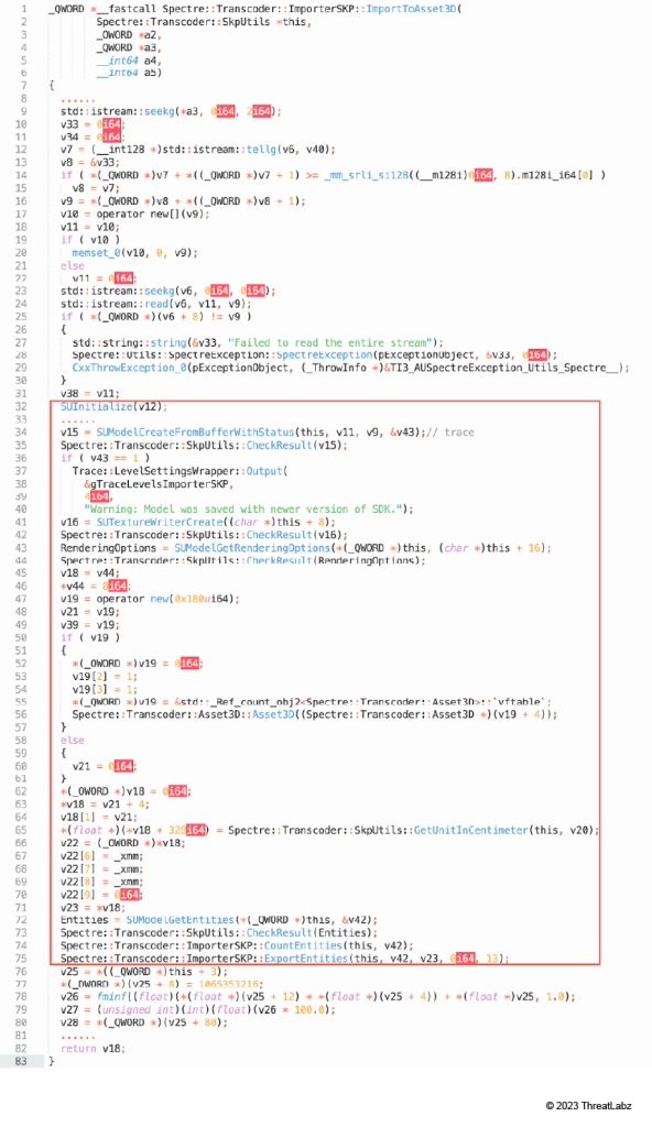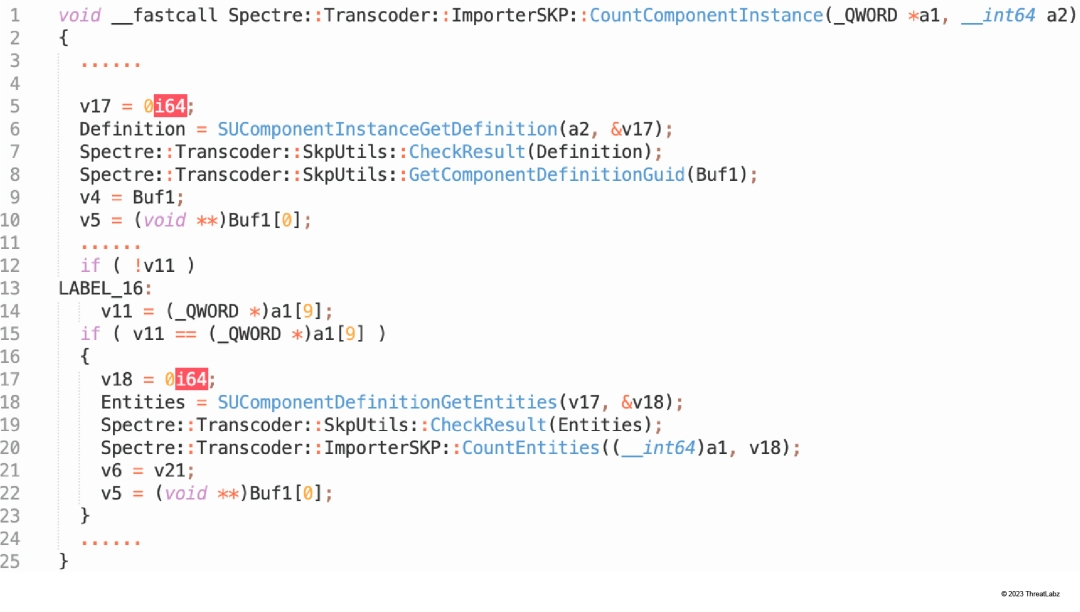 By combining reverse engineering MSOSPECTRE.DLL with dynamic debugging, we determined the function Spectre::Transcoder::ImporterSKP::ImportToAsset3D is responsible for parsing an SKP file in Microsoft 365 apps. Figure 7 provides a code snippet of its pseudo code.