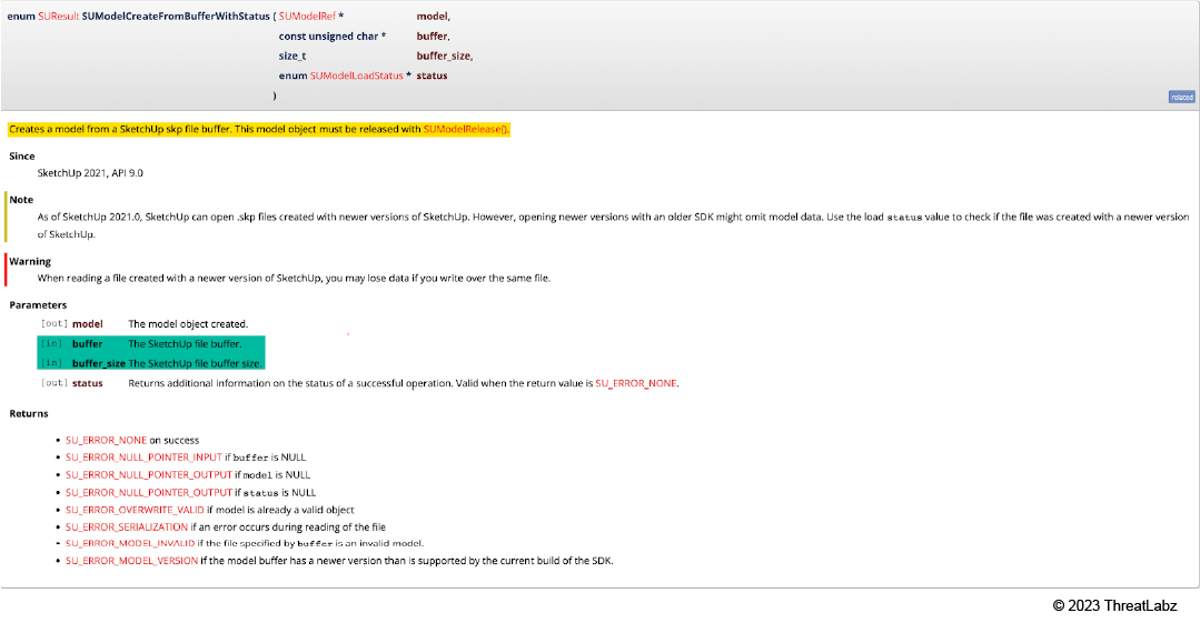 SketchUp provides an SDK, including a C API. The online C API documentation contains reference material for all functions, data structures, and enumerations in both the SketchUp C API and the SketchUp Importer/Exporter interface. This was helpful to create and refine our SketchUp fuzzing harness.