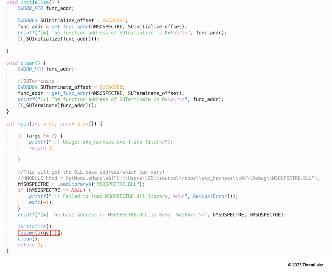 Figure 19 provides a code snippet for our SketchUp fuzzing harness. In the main function, the first step loads MSOSPECTRE.DLL using the LoadLibrary API, which returns the base address of MSOSPECTRE.DLL in memory. Then the function SUInitialize is called to initialize the SketchUp API functions. Once initialization occurs, the function fuzzme() is called. To ensure proper cleanup, the function SUTerminate is called.