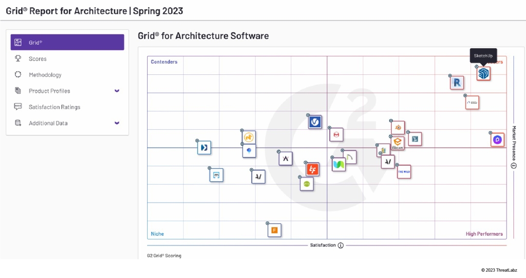 SKP is a proprietary file format developed by SketchUp Software for 3D modeling and design. An SKP file contains data and information necessary to create and render 3D models, including geometry, textures, materials, and more. The SKP format was originally developed in 2000 by @Last Software. Google acquired the SKP format in 2006, and then Trimble Navigation took ownership in 2012. The popularity of SketchUp has continued to grow and it was recently named the #1 architecture software program in the world (as shown in Figure 2), based on G2’s Grid® Report for Architecture, Spring 2023.