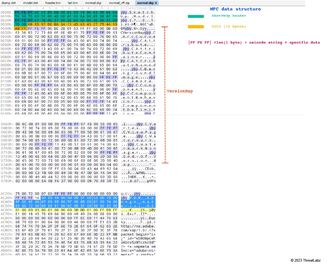 We created a diagram in Figure 23 for the MFC data type structure thanks to our analysis of SketchUpModelReaderMFC::ReadModel. The structure starts with a SketchUp header, then a GUID, followed by a versionMap, and other specific data. Inside the versionMap and data sections, there are often bytes that start with FF FE FF, followed by a length field (1 byte), and then a Unicode string. After the Unicode string, there is specific data.