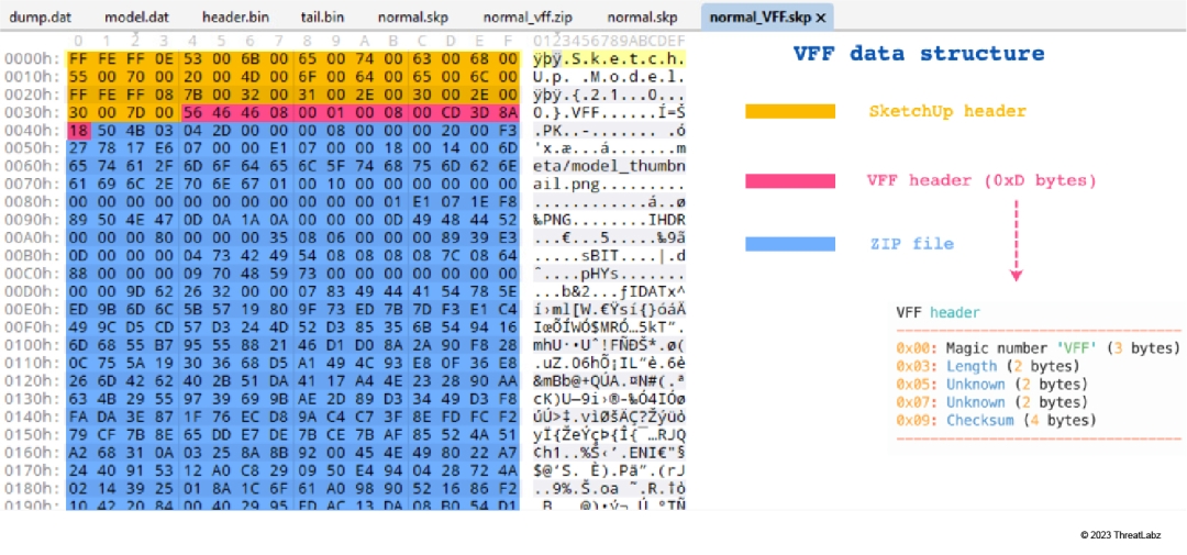 Next, we will explore the structure of an SKP file with the VFF data type. As illustrated in Figure 24, the structure starts with a SketchUp header, followed by a VFF header, and then a ZIP file. The VFF header contains 13 bytes of data, which includes the magic bytes ‘VFF’, followed by a length field indicating the length of the remaining VFF header, and then 4 bytes (currently unknown), and then a 4-byte checksum.