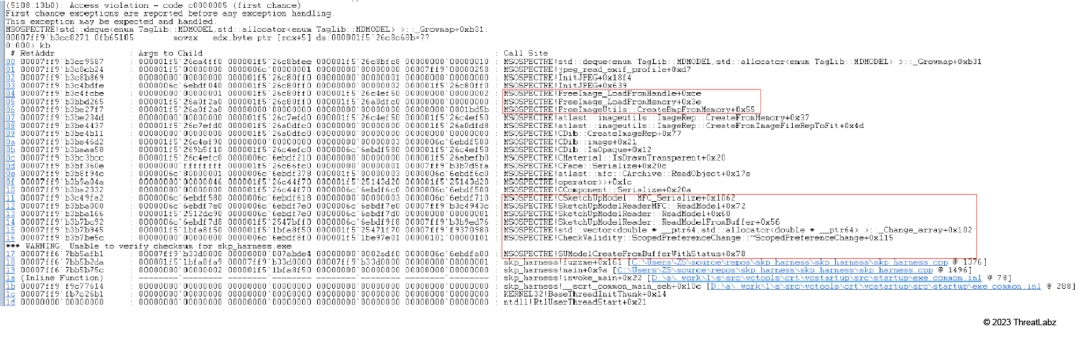 The dynamic library MSOSPECTRE.DLL (shown in Figure 5) is responsible for parsing 3D file formats in Microsoft 365 apps. Our vulnerability research on the SketchUp file format was conducted in version 16.0.16026.20000, which was released in January 2023.
