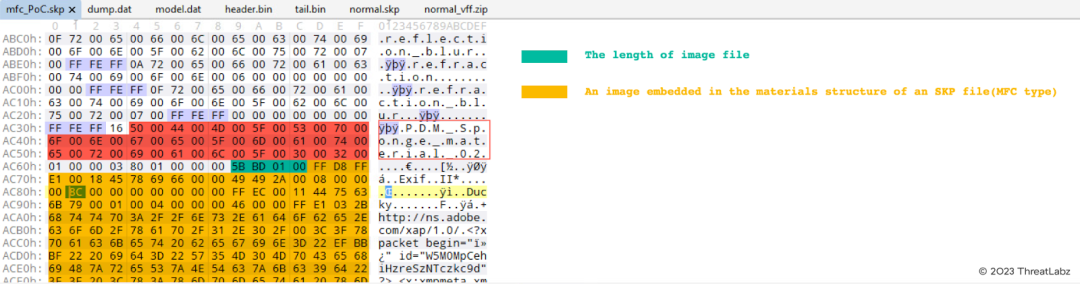 When comparing a normal SKP file to the minimized SKP PoC file, only 1 byte is mutated within a JPEG image that’s part of the ‘materials’ structure in the SKP file (as shown in Figure 26).