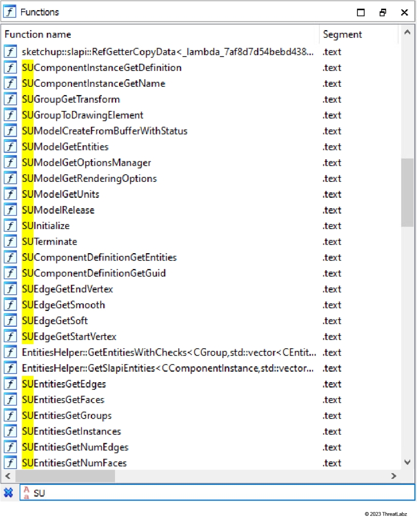 During our analysis of MSOSPECTRE.DLL using IDA Pro, a series of functions with names prefixed with "SU" caught our attention, as depicted in Figure 6. It's worth noting that these functions are, in fact, SketchUp C APIs sourced from the SketchUp SDK.
