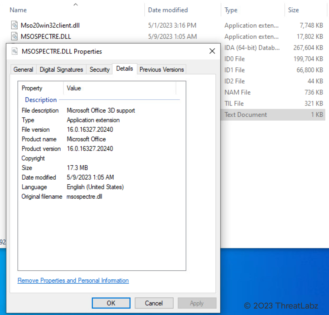 In May of 2023, the patch for CVE-2023-29344 was released and was intended to fix all vulnerabilities located in FreeImage. The patched version of MSOSPECTRE.DLL is 16.0.16327.20240, as shown in the figure below.