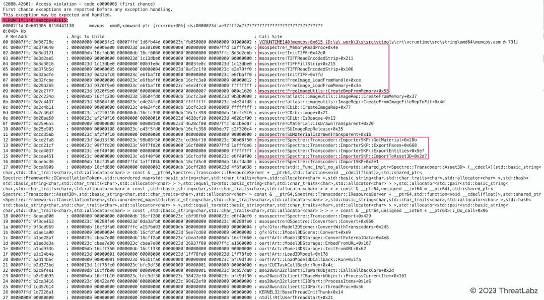The figure below shows an out-of-bounds write vulnerability (CVE-2023-29344) that is associated with the parsing of an SKP file containing an abnormal PICT image in Microsoft Office. The PoC file for this vulnerability is an SKP file with the MFC type.