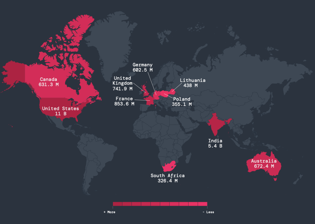 Figure 2: A map of the countries that experience the most encrypted attacks