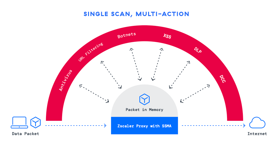 The foundation of Zscaler’s defense against encrypted threats is its full TLS/SSL inspection capabilities, enabled by a scalable proxy-based architecture. Unlike traditional hardware-based solutions that force organizations to compromise between security and speed, Zscaler’s cloud-native approach allows organizations to fully inspect traffic at scale with its unique Single Scan, Multi-Action engine—a unique feature that processes traffic once to apply multiple security controls simultaneously. This helps organizations to:
