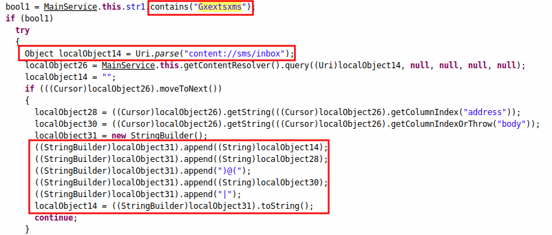 The Gxextsxms command is responsible for fetching all the SMS messages from the victim's device and sending it over to the C&C server.