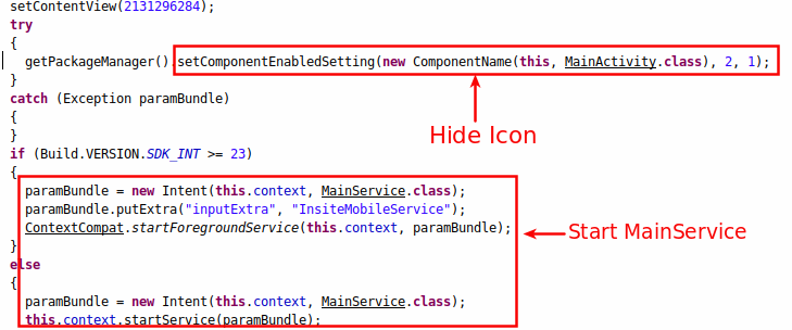 Behind the scenes, there are number of process occurring simultaneously. First, an activity named MainActivity fires up, taking care of hiding the icon and showing the fake notification. It also starts an Android service named MainService.