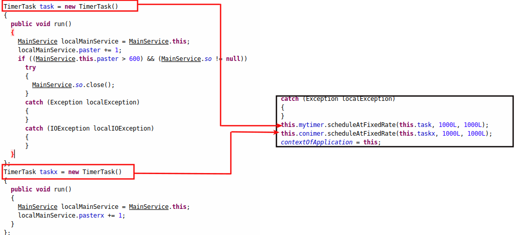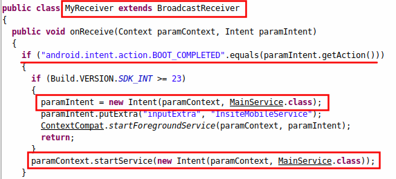 MyReceiver and AlarmReceiver start the MainService whenever appropriate events occur. This tactic is very common among malware developers to ensure the malware is not killed by the Android OS or by any other means.