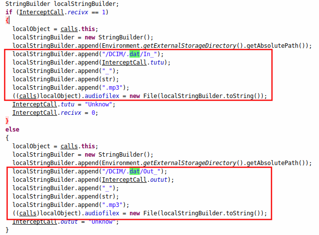 As seen above, the calls service stores incoming call details in .mp3 format in the /sdcard/DCIM/.dat/ directory with file name appended with "In_'' for incoming calls and "Out_'' for outgoing calls. How these recorded calls are sent to the command and control server (CnC) is taken care of by MainService, which is discussed next.