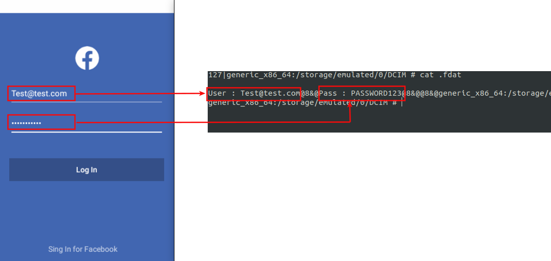 Upon receiving the command GUIFXB, the spyware launches a fake Facebook login page. As soon as the victim tries to log in, it stores the victim's credentials in /storage/0/DCIM/.fdat