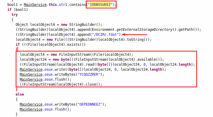 | dowsizetr | Send the file stored in the /sdcard/DCIM/.dat/ directory to the C&C server |