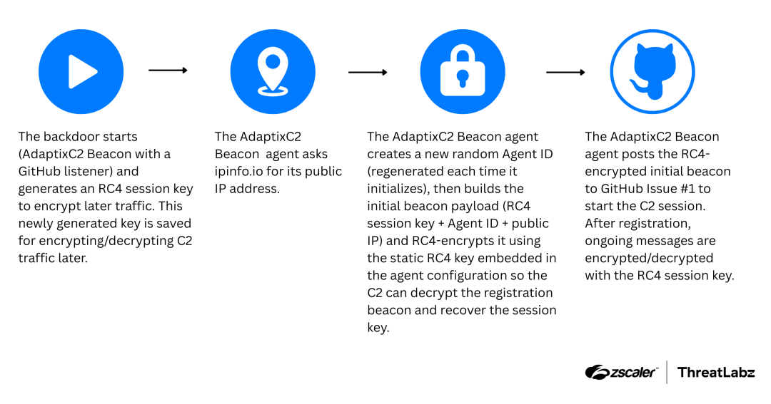 Cache-Control: no-cacheThe agent then sends a beacon to the C2 by performing a POST request to GitHub Issue #1 to establish a session. The beacon follows the standard AdaptixC2 format, which contains the RC4 session key and a random 4-byte number used as an agent ID. These values are RC4 encrypted using the key in the agent’s config, Note that the agent ID is regenerated each time the agent is initialized. The agent uses this ID to identify and process commands specifically intended for it. The following figure shows the C2 workflow: