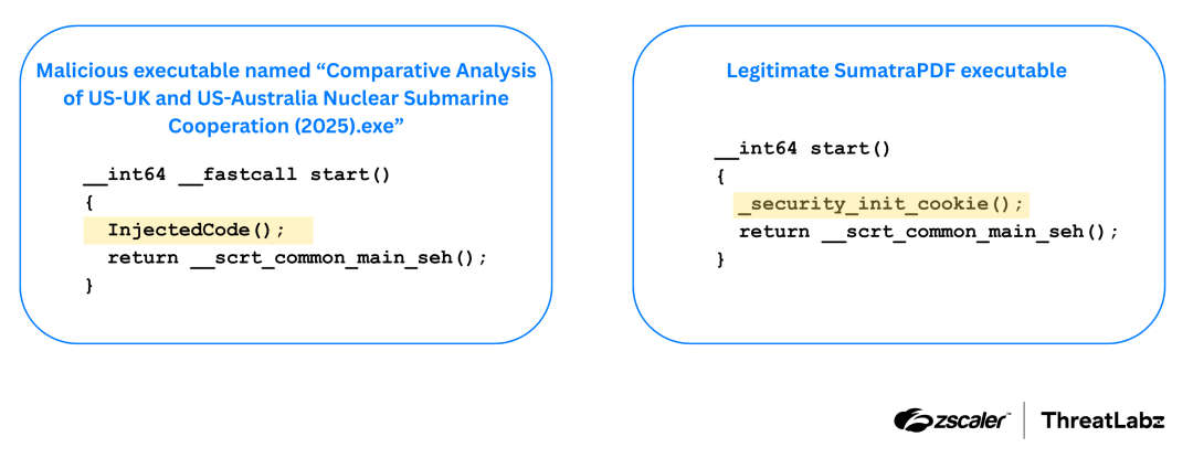 Figure 3: Comparison of the entry points in the trojanized and legitimate SumatraPDF versions.