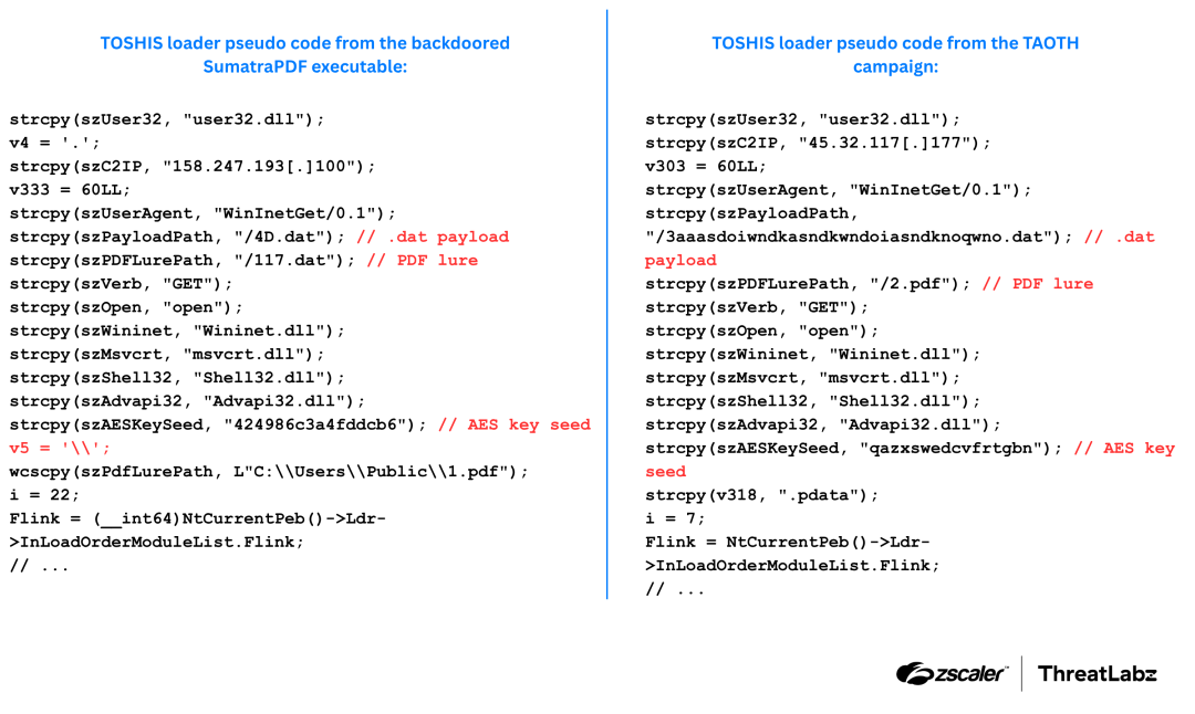 Figure 4: Code comparison of the TOSHIS loader in the backdoored SumatraPDF sample and the TOSHIS loader described in the TAOTH report.