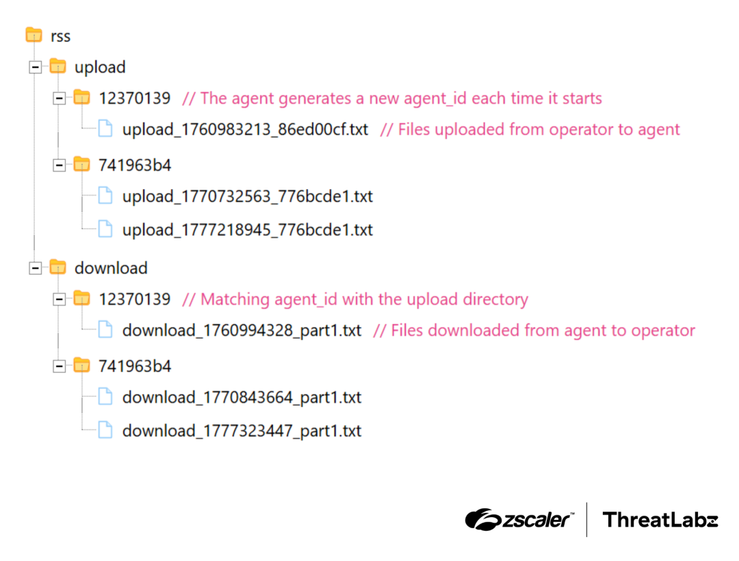 The agent then downloads the file from the repository, decodes its Base64-encoded contents, and queues the task for processing.If the title starts with “fileupload”: The agent extracts and Base64 decodes the “body” field, and queues the task for processing. This encrypted task contains the file path that the agent should exfiltrate. Note that there is no agent ID check here, so all agents will attempt to execute this task.
