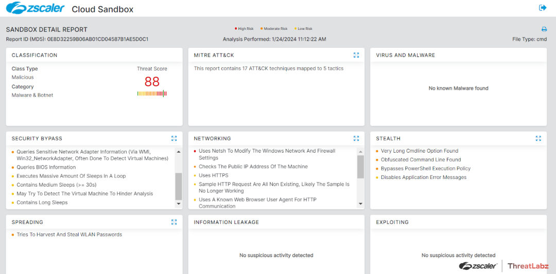 During our investigation of this campaign, the Zscaler Sandbox played a crucial role in analyzing the behavior of various files. Because of the sandbox analysis, threat scores and specific MITRE ATT&CK techniques triggered were identified.