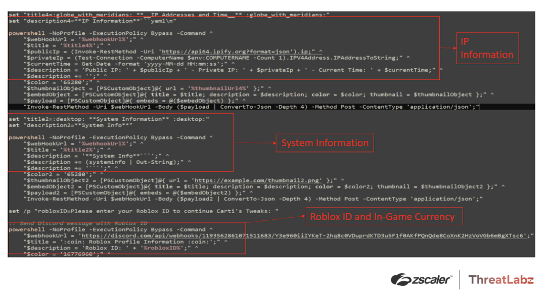 - The stealer is Powershell-based and exfiltrates sensitive data like user information, location, Wi-Fi profiles, and passwords, Roblox IDs, and in-game currency details.